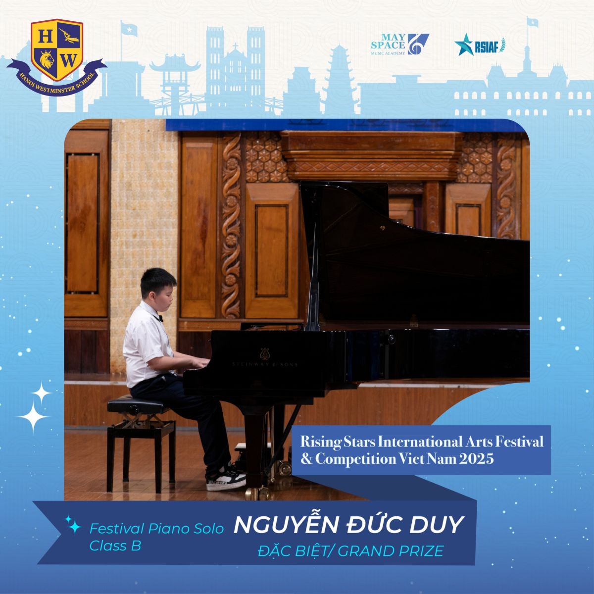 Bạn Nguyễn Đức Duy lớp 6Cam1 đạt giải Đặc biệt trong kỳ thi Âm nhạc Rising Stars International Arts Festival & Competition Vietnam 2025.