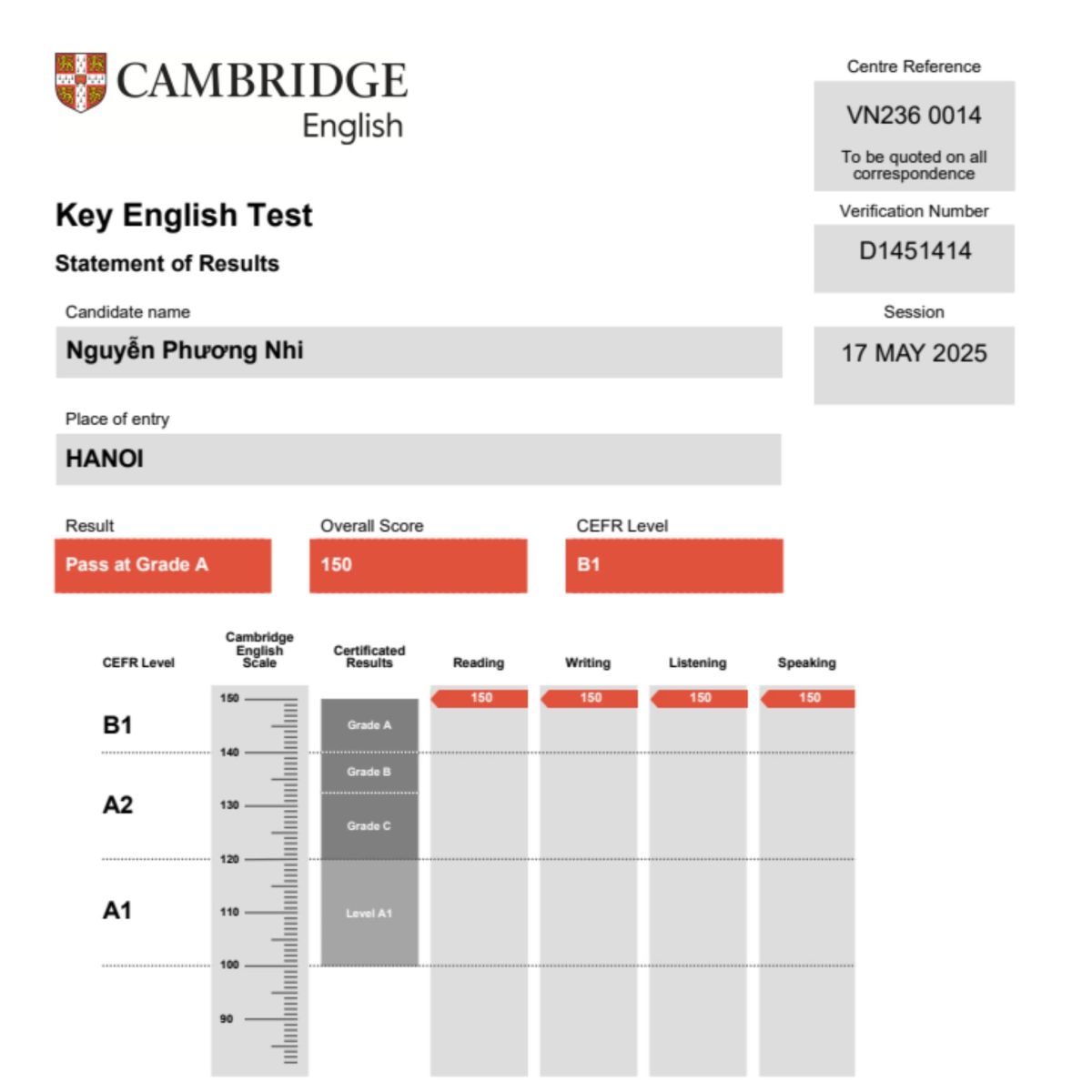 Bạn Nguyễn Phương Nhi lớp 5Cam2 đạt điểm tối đa trong kỳ thi Cambridge KET.