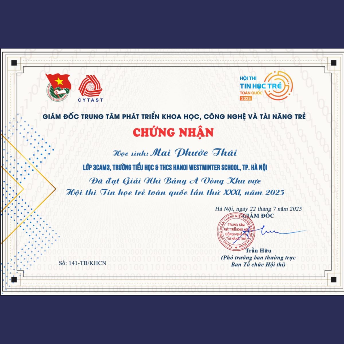 Bạn Mai Phước Thái lớp 4Cam3 đạt giải nhì khu vực trong cuộc thi Tin học trẻ toàn quốc lần thứ XXXI