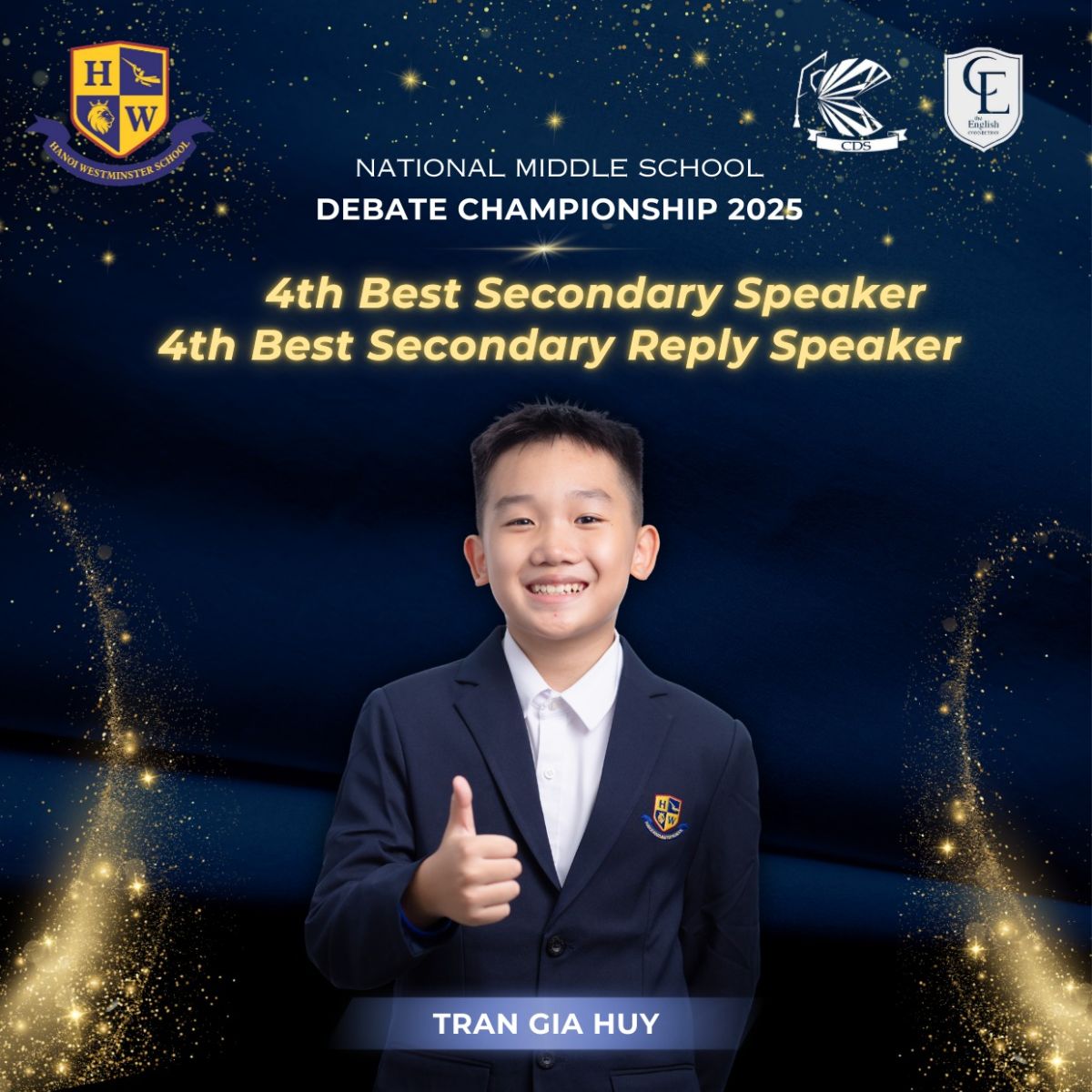 Chúc mừng Trần Gia Huy với Top 4 Best Secondary Speaker và Top 4 Best Secondary Reply Speaker!